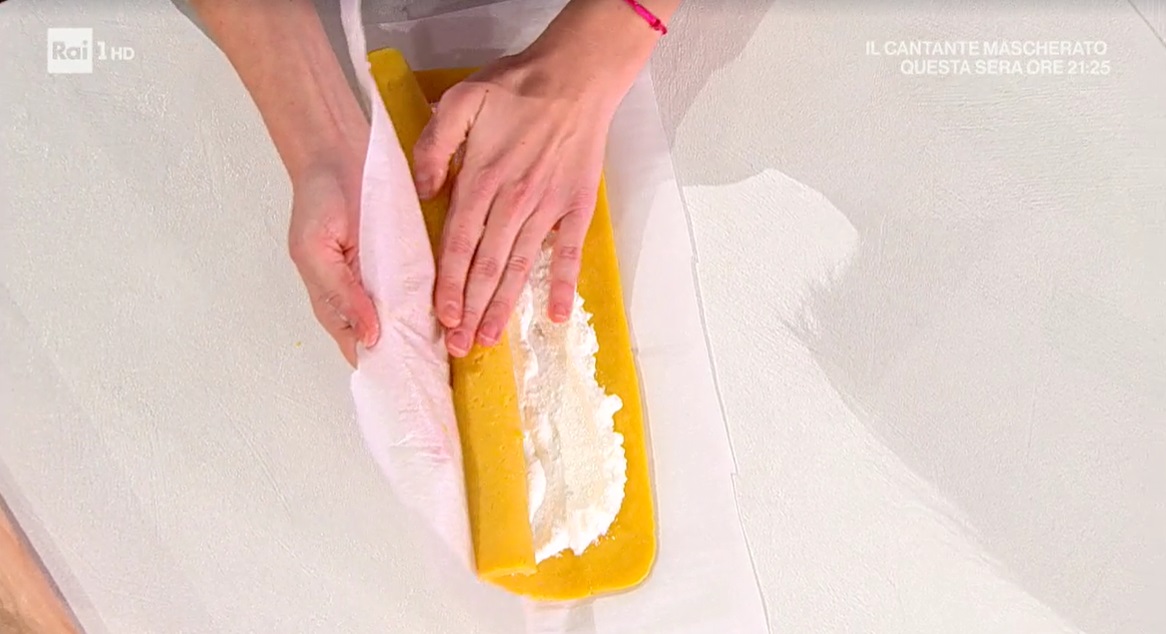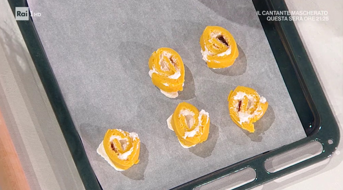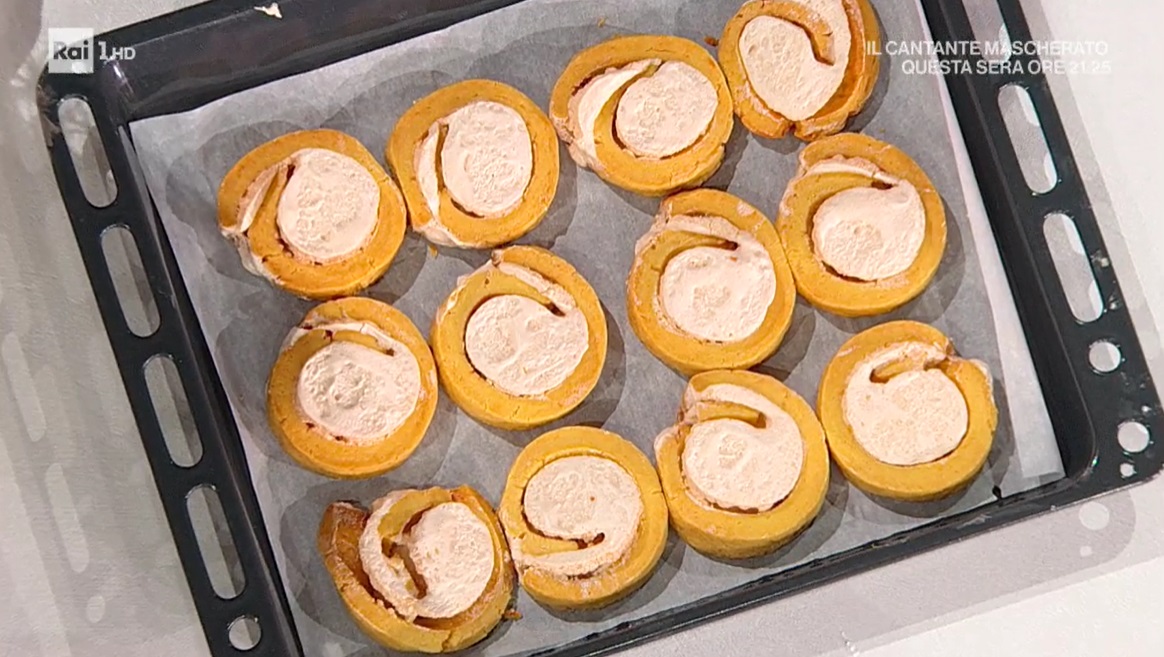 Spalmiamo la meringa sul rettangolo di frolla, lasciando pulito 1 cm sui bordi. Arrotoliamo la frolla sulla meringa, partendo dal lato lungo. Facciamo riposare ancora mezz’ora in frigorifero. Tagliamo il rotolo ottenuto in 12 fette. Disponiamo le fette sulla teglia con carta forno e cuociamo in forno caldo e ventilato a 150° per 55 minuti.