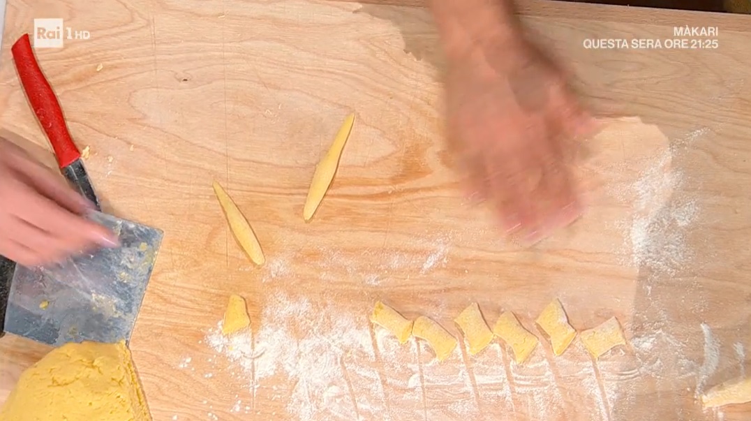 Barbara cuoce le patate al vapore, con un rametto di rosmarino. Le schiacciamo con uno schiacciapatate quando sono ancora calde. Uniamo da subito il burro, sale, pepe e noce moscata e mescoliamo, in modo da sciogliere il burro. Lasciamo raffreddare il composto, quindi incorporiamo l’uovo intero e le patate. Impastiamo fino ad ottenere un composto omogeneo. Formiamo dei salsicciotti, che tagliamo a tocchetti un po’ più lunghi del solito. Li allunghiamo con la mano, roteandoli sul piano: sono simili a delle trofie. Li disponiamo su vassoi con carta forno.
