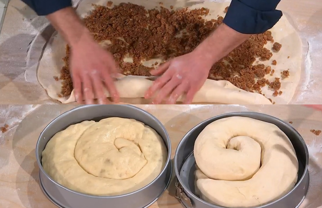 Stendiamo l’impasto lievitato sul piano infarinato, con il matterello, fino ad ottenere un rettangolo spesso circa 1 cm. Sbricioliamo sopra il ripieno, lasciando liberi un paio di cm dal bordo. Arrotoliamo l’impasto sul ripieno, partendo dal lato lungo. Otterremo un salsicciotto, che arrotoliamo su se stesso, in modo da formare un chiocciola. La inseriamo all’interno di una tortiera imburrata da 30 cm di diametro. Copriamo con la pellicola e lasciamo lievitare fino al raddoppio a temperatura ambiente.