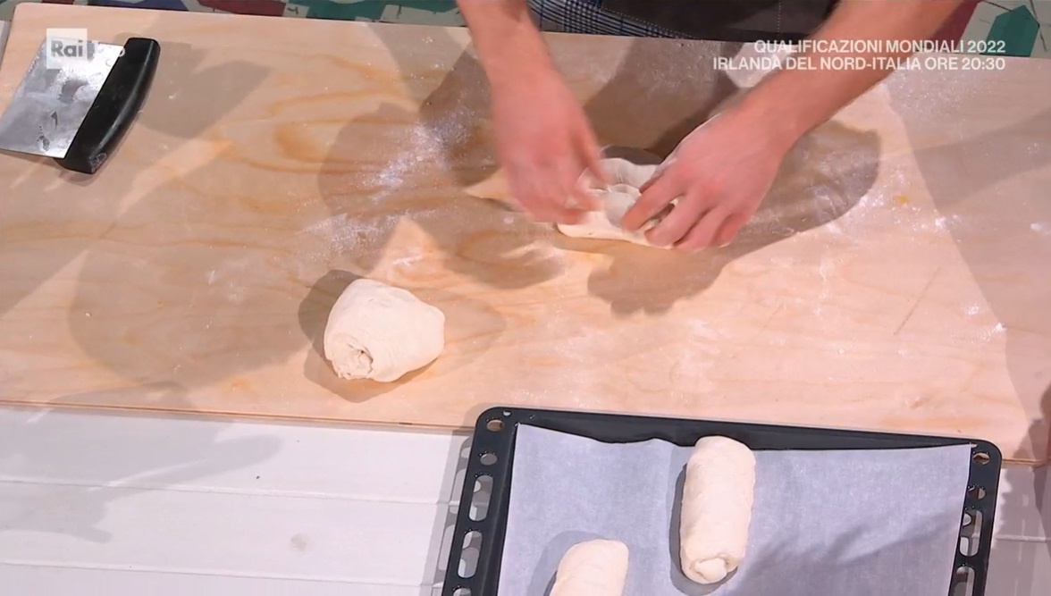 Allarghiamo l’impasto lievitato sul piano infarinato, con le mani. Dividiamo il rettangolo ottenuto in panetti da 150 g circa (ne otterremo circa 6-8) e ripieghiamo ognuno su se stesso, in modo da ottenere dei filoncini. Li disponiamo su una teglia con carta forno, ben distanziati, copriamo con un canovaccio e lasciamo lievitare ancora fino al raddoppio del volume. Cuociamo i panini in forno preriscaldato e statico a 240° per 10 minuti.