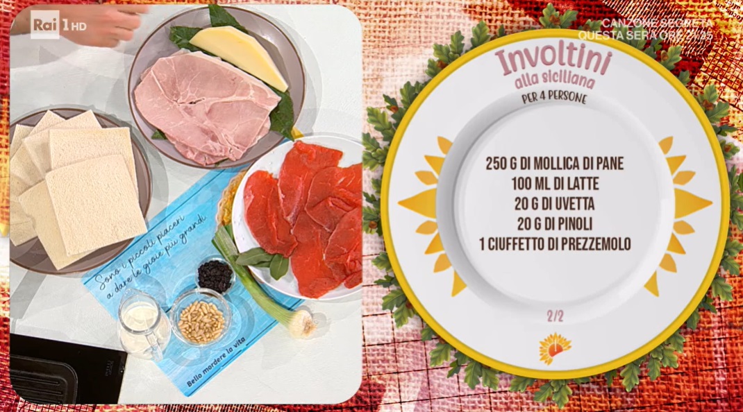 - Per 4 persone: 16 fettine di manzo, 100 g caciocavallo, 100 g prosciutto cotto, 1 cipollotto, 1 foglia di alloro, 250 g mollica di pane, 100 ml latte, 20 g uvetta, 20 g pinoli, prezzemolo