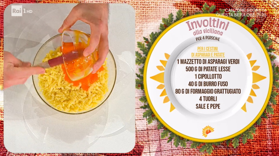 - 1 mazzetto asparagi verdi, 500 g patate lesse, 1 cipollotto, 40 g burro fuso, 80 g formaggio grattugiato, 4 tuorli, sale e pepe