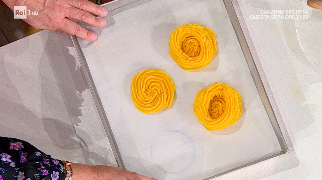 Passiamo al contorno: lessiamo le patate, le peliamo e le schiacciamo. Mettiamo la purea di patate in una ciotola ed uniamo i tuorli, il formaggio grattugiato, il burro fuso, sale e pepe. Mescoliamo e inseriamo in una sacca da pasticcere con bocchetta rigata. Disegniamo dei cerchi su una teglia con carta forno, usando il nostro impasto: creiamo una sorta di nido dai bordi più alti.