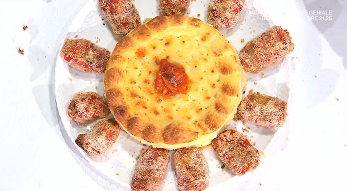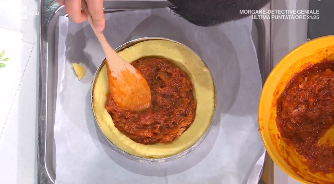Schiacciamo le patate lesse e le condiamo con sale, pepe ed uniamo le uova intere. Mescoliamo fino ad ottenere un composto omogeneo. All’interno di un anello unta e spolverata con pangrattato, formiamo una base con l’impasto di patate ed anche i bordi. Farciamo il guscio di patate con la salsa allo sfincione e copriamo con il caciocavallo a fette. Copriamo con l’impasto di patate rimasto. Passiamo in forno caldo a 190° per 20 minuti.
