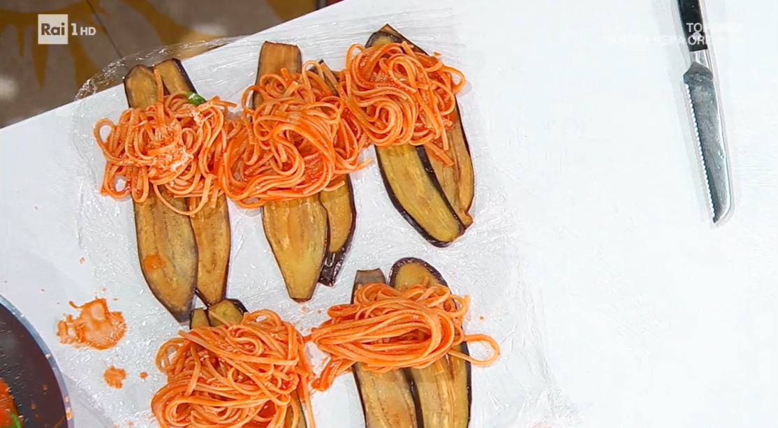 Prendiamo due fettine di melanzana e le sovrapponiamo leggermente su un foglio di pellicola. Sopra mettiamo un po’ di pasta al pomodoro ed avvolgiamo le melanzane sulla pasta, in modo da formare l’involtino. Disponiamo quest’ultimi all’interno di una pirofila, su uno strato di salsa di pomodoro. Copriamo con altro sugo e finiamo con abbondante ricotta salata grattugiata. Passiamo in forno caldo a 180° per 10 minuti. Serviamo gli involtini con la mozzarella fresca, che ognuno prenderà a suo piacimento.