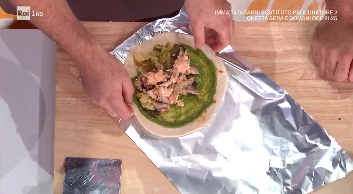Posizioniamo il pane arabo su un foglio di carta d’alluminio. Spalmiamo sopra la salsa verde, quindi distribuiamo su questa la verza spadellata, il tacchino sfilacciato e, infine, la salsa ai peperoni. Aiutandoci con la carta alluminio, arrotoliamo il pane sul ripieno, sigillandolo per bene all’interno, e chiudiamo a cartoccio con la carta alluminio: possiamo prepararlo anche in anticipo. Prima di servirlo, tagliamo a metà, tenendo la carta.