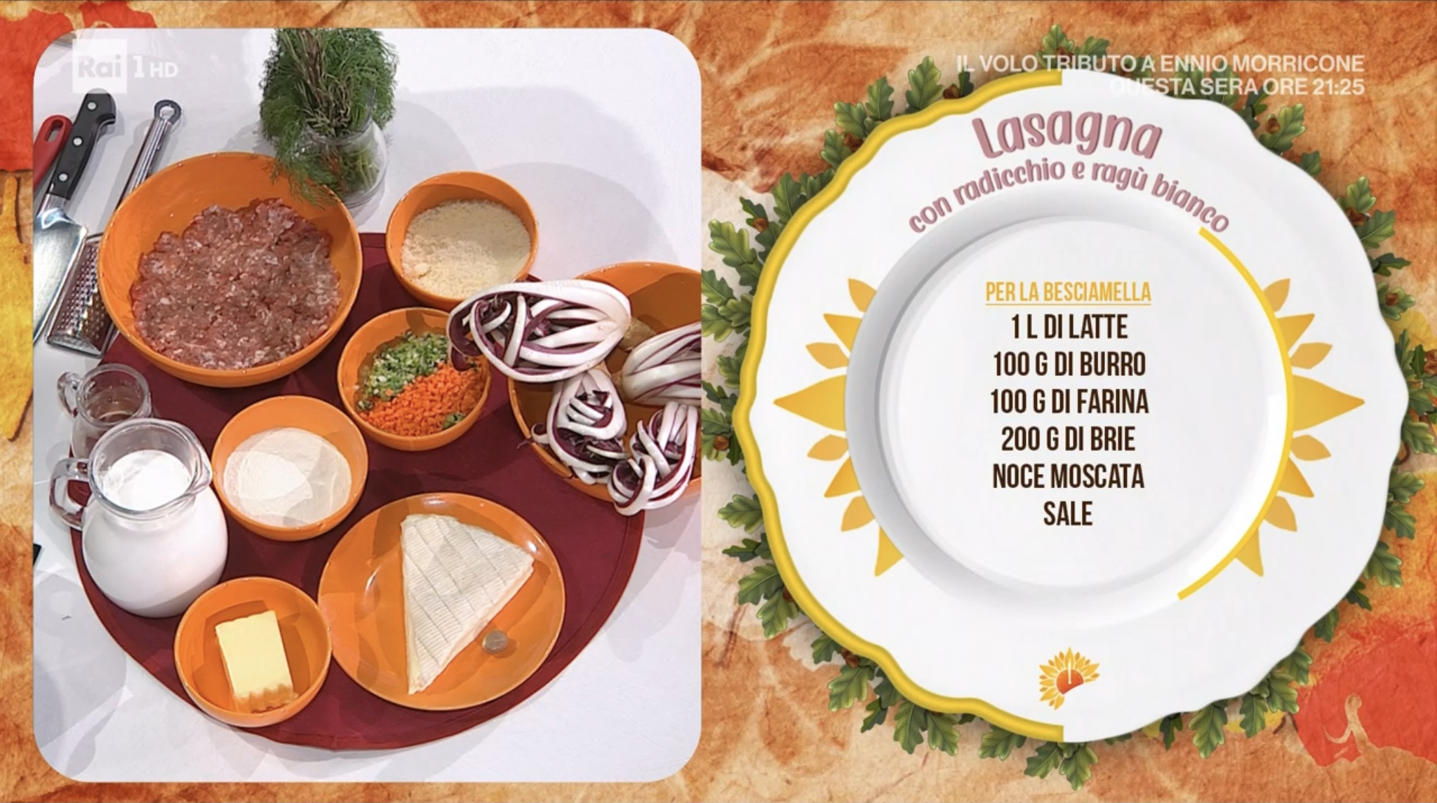 - Besciamella: 1 l latte, 100 g burro, 100 g farina, 200 g brie, noce moscata, sale
