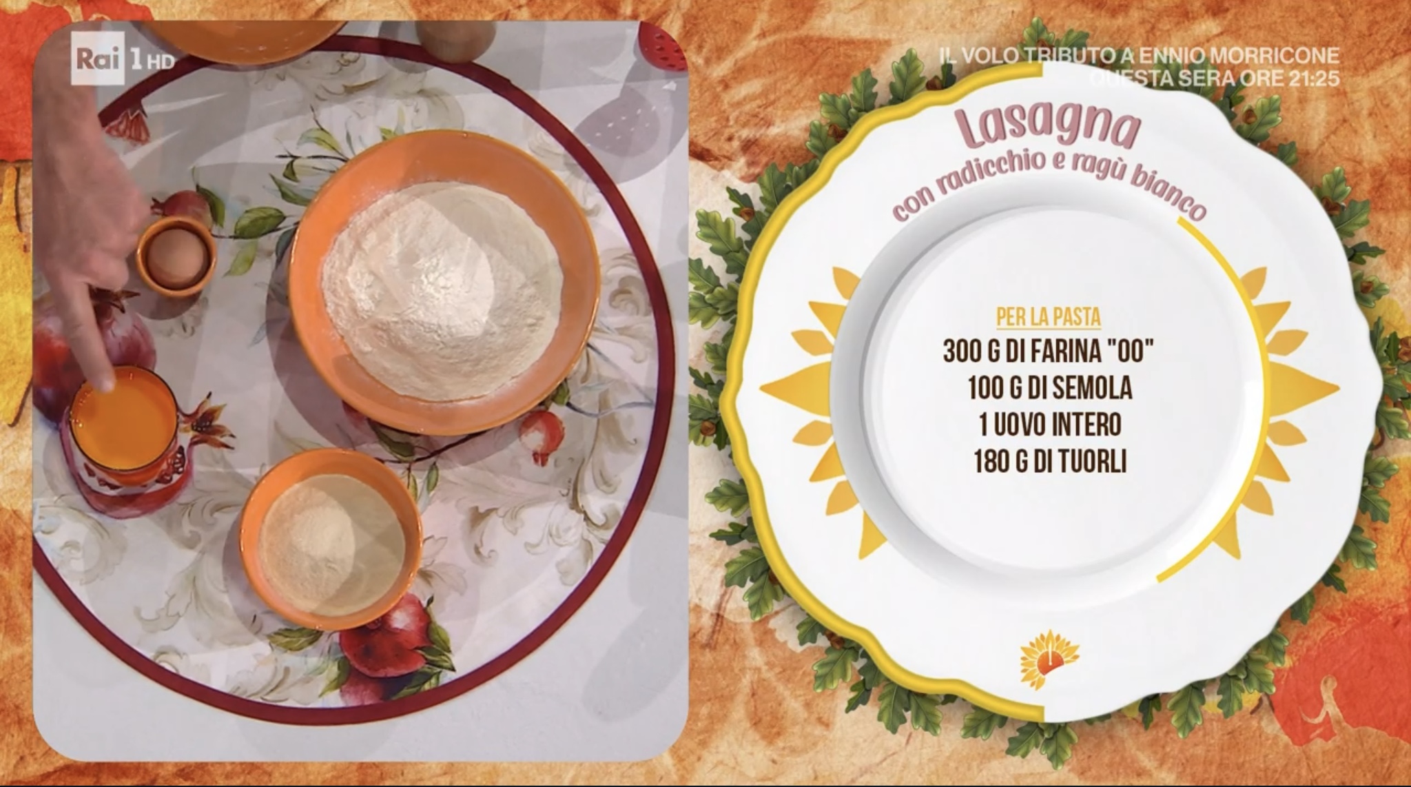- Sfoglia: 300 g farina 00, 100 g semola, 1 uovo intero, 180 g tuorli