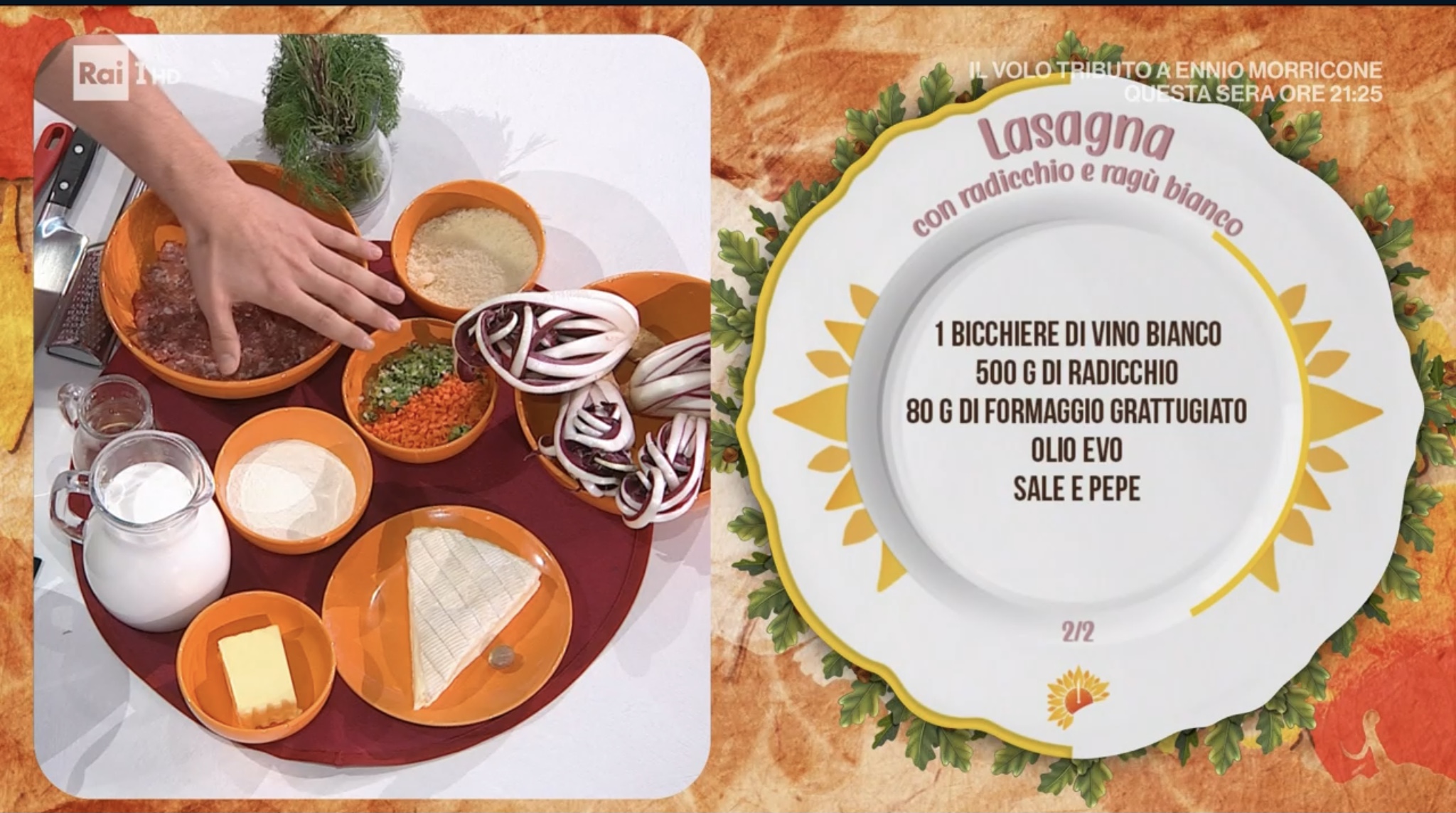 - Ripieno: 400 g macinato di maiale, 1 costa di sedano, 1 cipollotto, 1 carota, rosmarino, finocchietto, 1 bicchiere di vino bianco, 500 g radicchio, 80 g parmigiano grattugiato, olio evo, sale e pepe