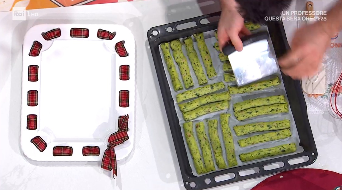 In una pentola colma d’acqua, lessiamo i broccoli, le bietole ed il finocchietto. Scoliamo e tritiamo al coltello. Rimettiamo le verdure tritate nell’acqua in cui le abbiamo lessate. Aggiungiamo anche la pancetta tagliata a dadini (da cruda), il peperoncino tritato se gradito e portiamo nuovamente a bollore. Quando l’acqua sta per bollire, versiamo a pioggia il semolino, mescolando nel frattempo con una frusta. Quando il composto arriva a bollore e si addensa, aggiungiamo i tuorli d’uovo ed il perocino grattugiato. Mescoliamo e lasciamo bollire qualche minuto, continuando a mescolare: otterremo una sorta di polenta. Inseriamo la polentina in una sacca da pasticcere e formiamo dei cilindri su una teglia con carta forno (possiamo anche creare delle cupolette con lo sporzionatore da gelato). Cuociamo in forno caldo e statico a 180° per 10 minuti.
