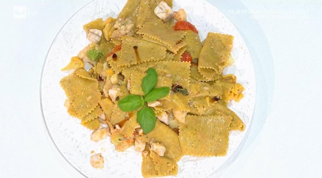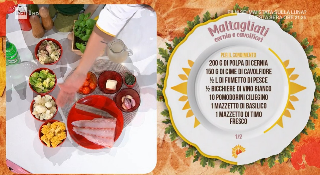 maltagliati cernia e cavolfiori di Ivano RicchebonoL’arrogante del cast, Ivano Ricchebono, ruba gli attrezzi del mestiere a Fulvio Marino per preparare la sua ricetta, rigorosamente ligure. Ivano prepara un primo piatto raffinato ed inedito, i maltagliati cernia e cavolfiori.