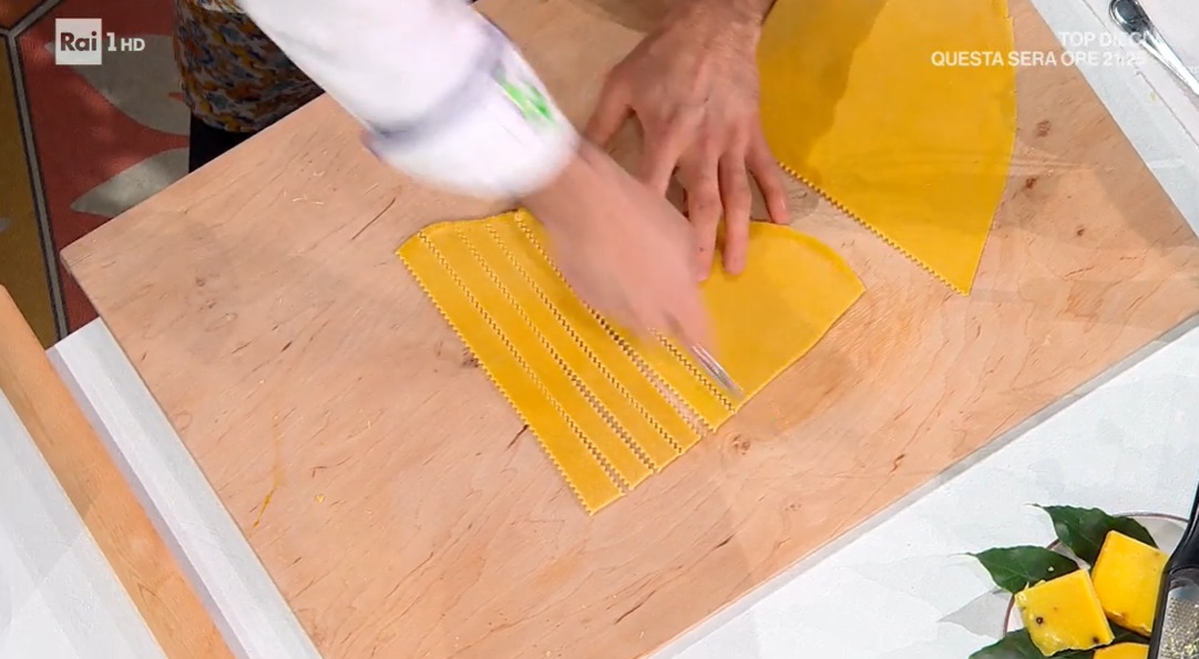 Prepariamo la pasta all’uovo lavorando la farina e la semola con le uova intere. Avvolgiamo il panetto ottenuto nella pellicola, lasciamo riposare mezz’ora e, successivamente, tiriamo la sfoglia abbastanza sottile.