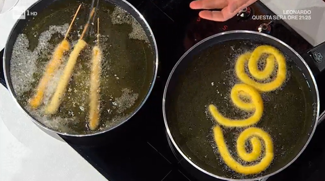 Scaldiamo una padella d’olio profondo. Formiamo delle spirali di patate su quadrati di forno, che immergiamo direttamente nell’olio ben caldo: quando la carta si stacca, la eliminiamo. Lasciamo friggere fino a doratura.