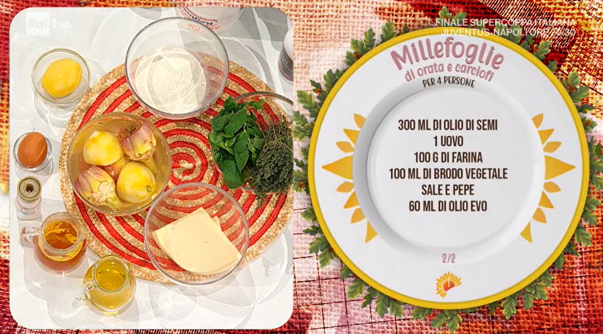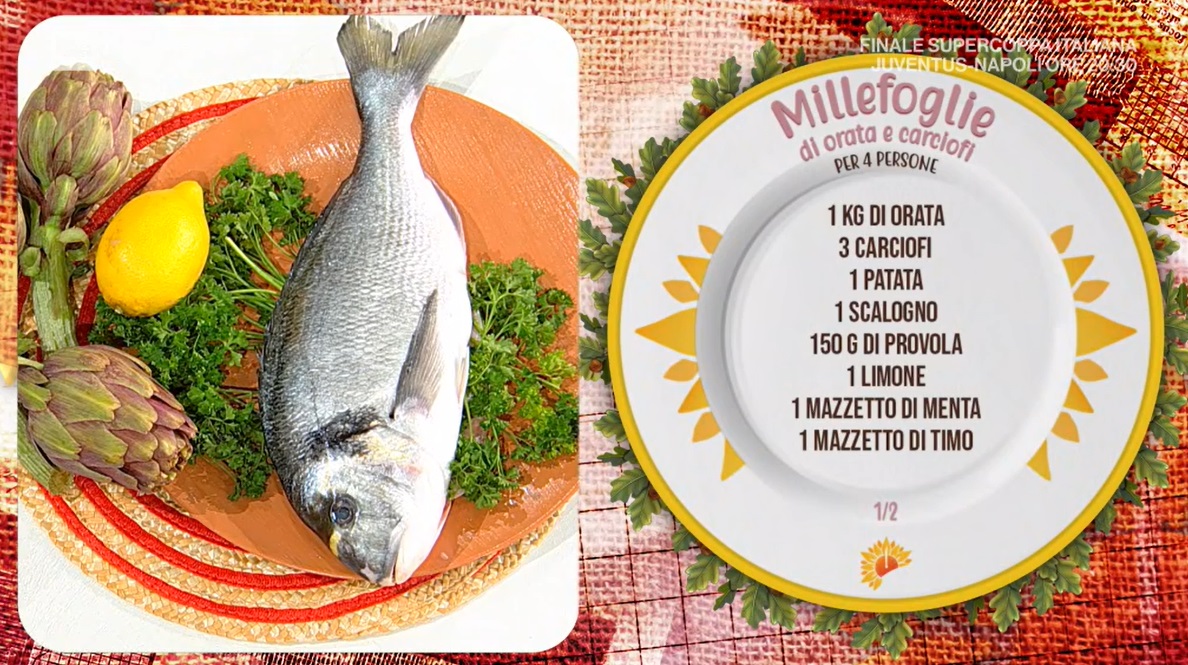 millefoglie di orata e carciofiMauro e Mattia Improta, padre e figlio, tornano protagonisti con la loro cucina e la loro dilagante simpatia. Se Mattia è impegnato a fare il ‘provolone’ con la Marsetti, Mauro è impegnato a ‘controllare’ il figlio e a preparare un secondo piatto raffinato a base di pesce. Ecco la millefoglie di orata e carciofi.