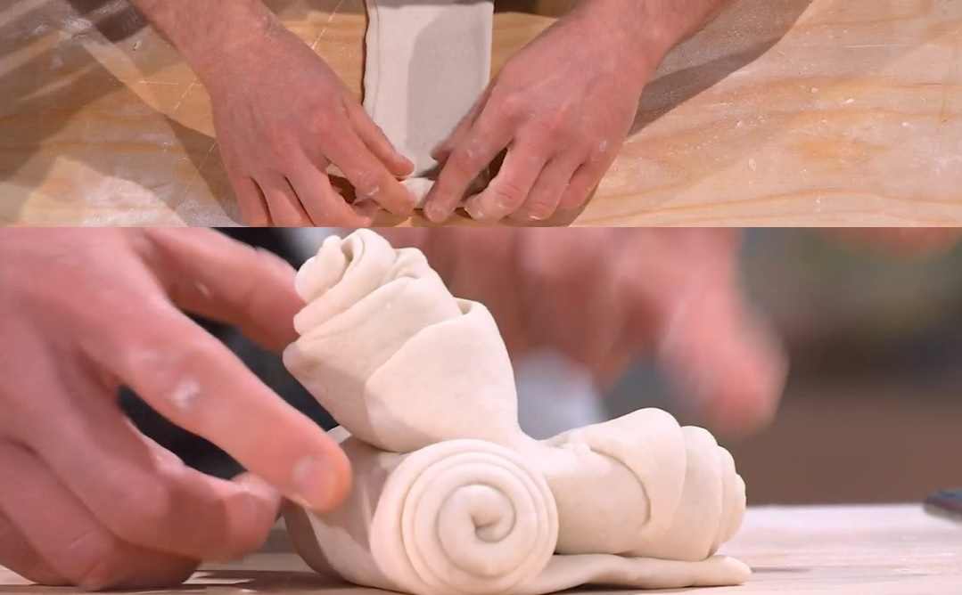 Con il mattarello, stendiamo ogni panetto in modo da ottenere una lingua. La pieghiamo su se stessa, per il lungo, quindi la allunghiamo ancora con il mattarello. Ottenuta una lingua sottile e lunga, larga circa 5 cm, la arrotoliamo su se stessa, a formare una chiocciola. Teniamo da parte. Creiamo un’altra chiocciola, seguendo il procedimento appena spiegato. Sovrapponiamo una chiocciola all’altra, su un lato, premendo con la mano. Disponiamo su una teglia, copriamo e lasciamo lievitare per 1 ora a temperatura ambiente.