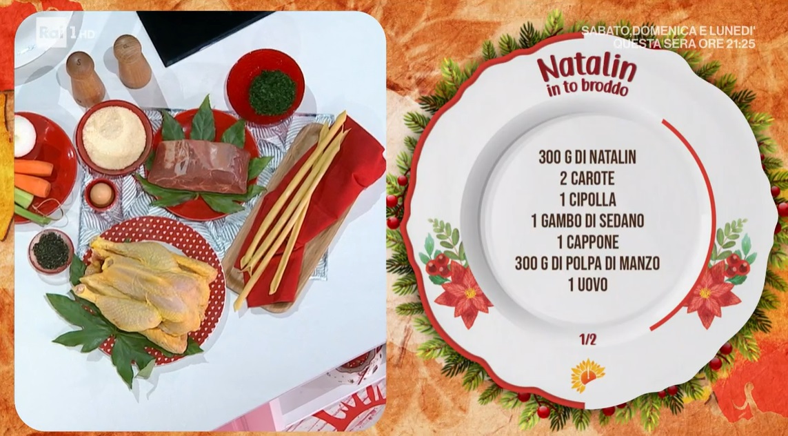 - 300 g natalin, 2 carote, 1 cipolla, 1 gambo di sedano, 1 cappone, 300 g polpa di manzo, 1 uovo, 100 g formaggio grattugiato, maggiorana e prezzemolo