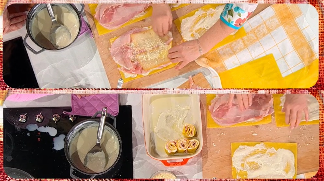 Disponiamo le sfoglia di pasta sul piano. Spalmiamo su ognuna un po’ di besciamella, disponiamo sopra le fette di prosciutto e quelle di fontina, spolveriamo con il parmigiano grattugiato ed arrotoliamo le sfoglie sul ripieno, in modo da ottenere dei cannelloni. Tagliamo quest’ultimi a fette spesse circa 5 cm e disponiamo le rose ottenute all’interno di una pirofila imburrata e ‘sporcata’ con della besciamella, rivolgendo il taglio verso l’alto. Copriamo con la besciamella rimasta, la salsa di pomodoro al basilico, spolveriamo con il parmigiano e cuociamo in forno caldo e statico a 180° per 25 minuti.