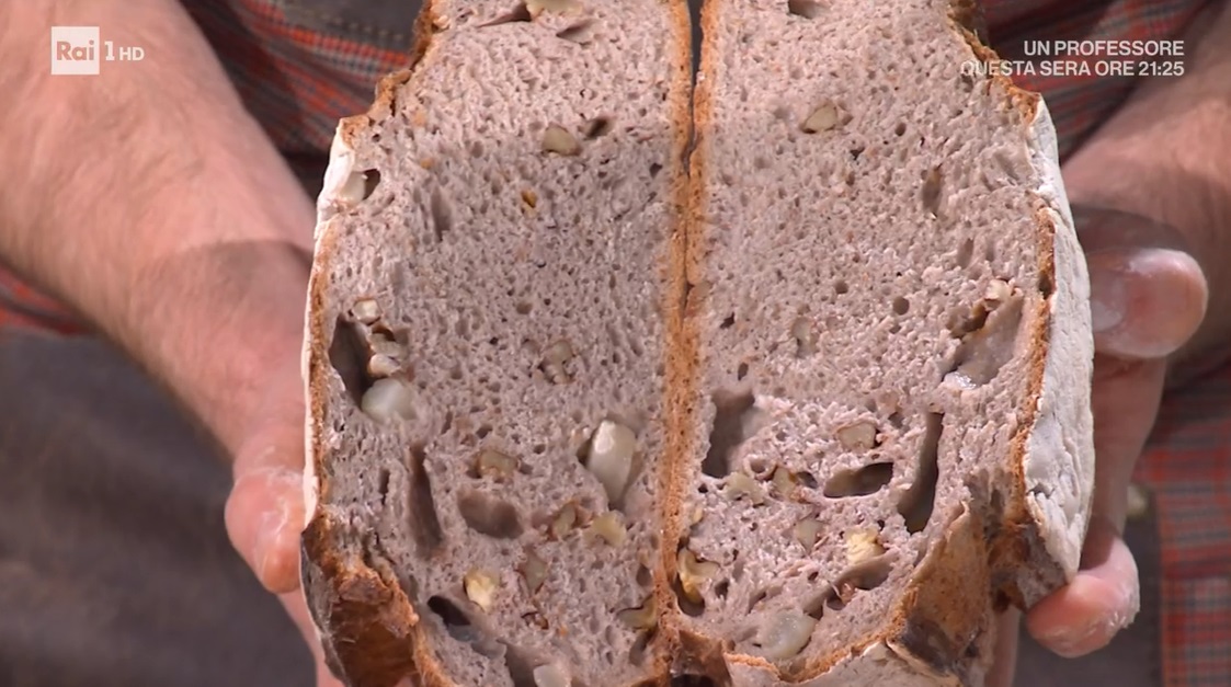 - 800 g farina tipo 2, 200 g segale integrale, 200 g lievito madre, 600 g acqua, 50 g miele, 10 g cannella in polvere, 20 g sale, 50 g burro, 100 g noci sgusciate, 100 g pere a cubetti