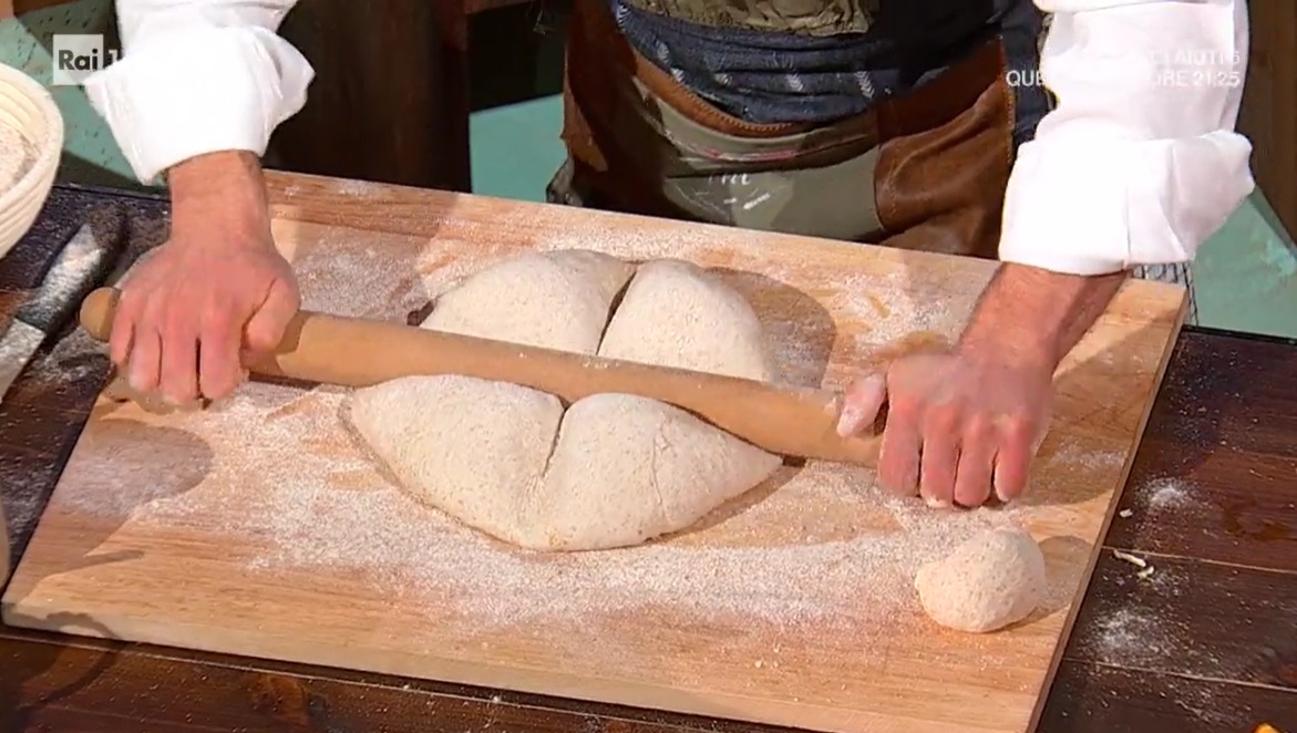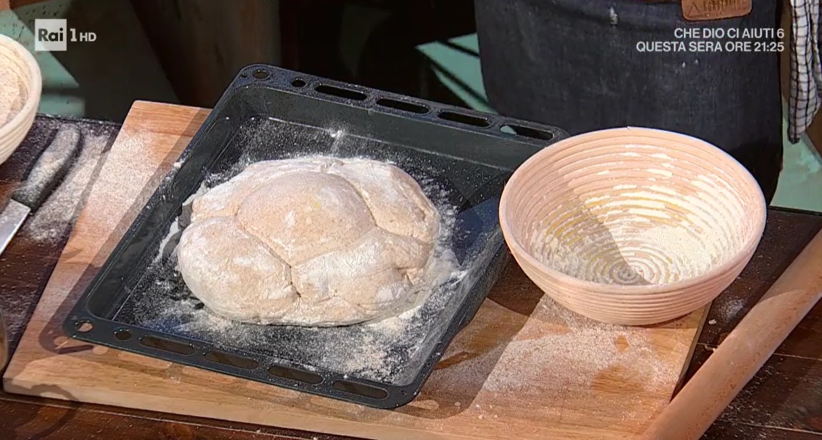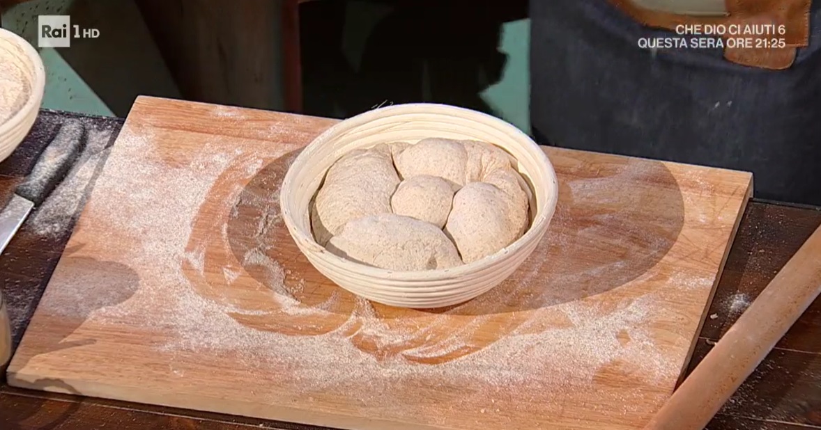 Dopo 3 ore di lievitazione totale, preleviamo una pallina da 50 g dall’impasto lievitato. Con il mattarello, pressiamo sulla pagnotta grande, in modo da formare una croce. Inseriamo al centro la palla da 50 g e trasferiamo il pane all’interno di un cestino da parte rotondo. Lasciamo lievitare, coperto, per 1 ora e 40 minuti.