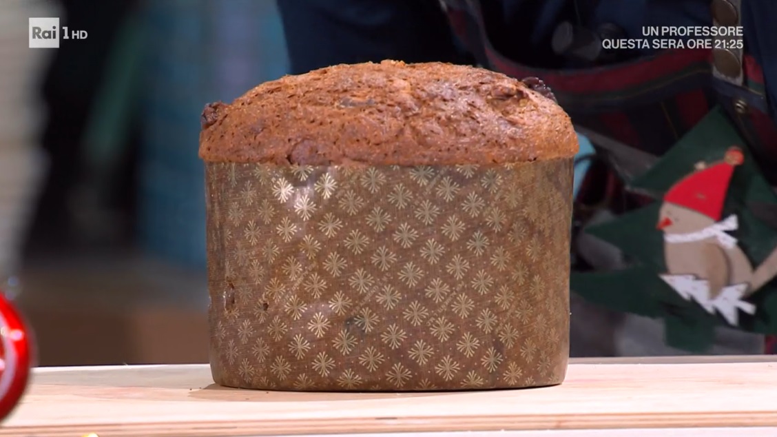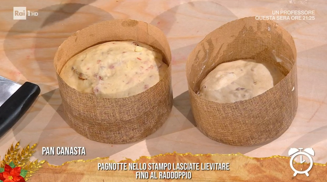 Dividiamo l’impasto a metà, per ottenere due forme da 1 kg. Imburriamo uno stampo da panettone ed inseriamo metà dell’impasto, dando la forma di una palla liscia. Schiacciamo leggermente, copriamo e lasciamo lievitare fino al raddoppio del volume iniziale: deve superare i 3/4 dell’altezza dello stampo. Spalmiamo sopra la glassa preparata, delicatamente. Distribuiamo sopra delle noci e cuociamo in forno caldo a 180° per 50 minuti (anche di più; vale la prova stecchino, come per le torte).