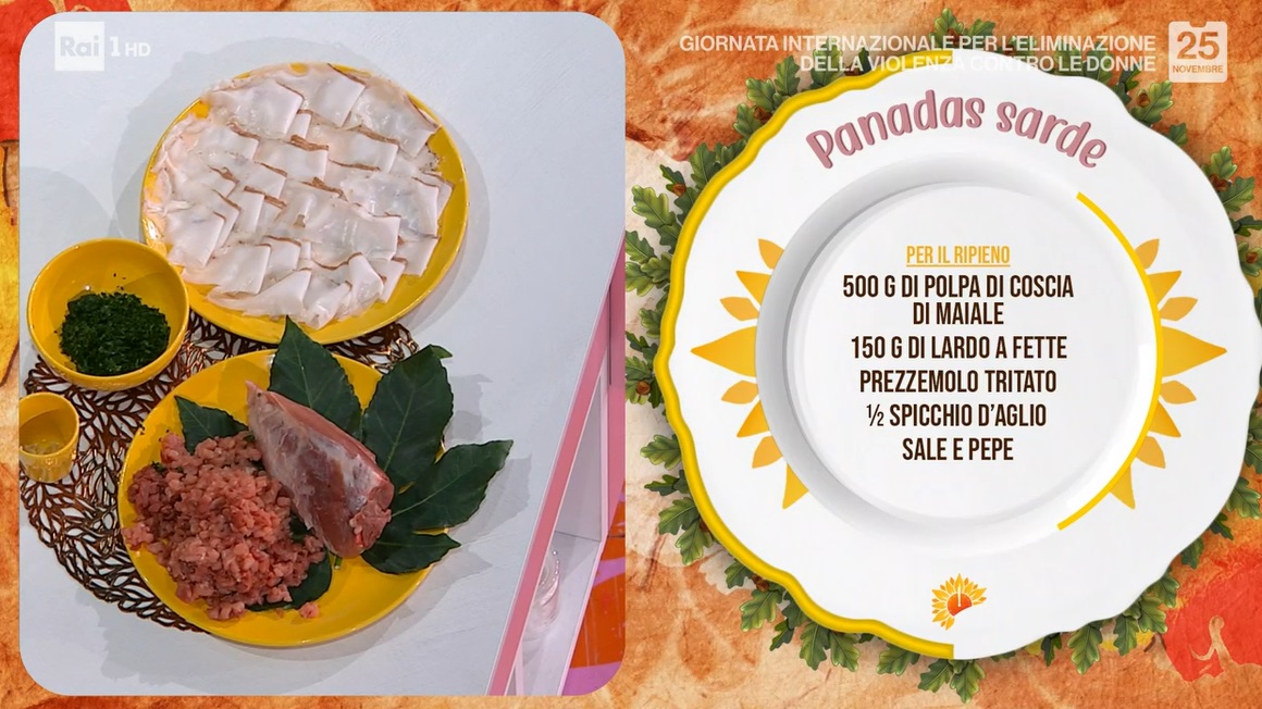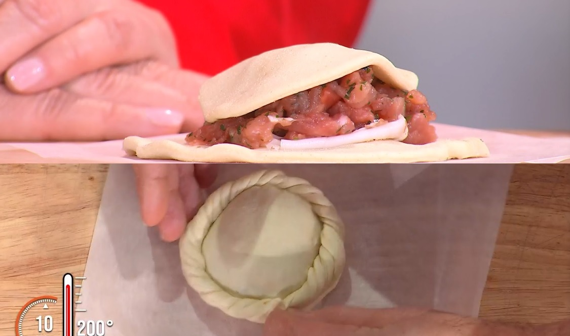 Sui dischi di pasta più larghi, mettiamo una fettina di lardo e distribuiamo sopra la carne di maiale condita. Copriamo con il dischetto di pasta più piccolo, quindi sigilliamo bene i bordi, pizzicandoli con le dita. Eliminiamo l’eccesso con una rotella e ripieghiamo, in modo da ottenere il tipico bordo delle panadas (possiamo fermarci alla fase precedente). Cuociamo in forno caldo e statico a 200° per 10 minuti, poi a 175° per altri 20 minuti.