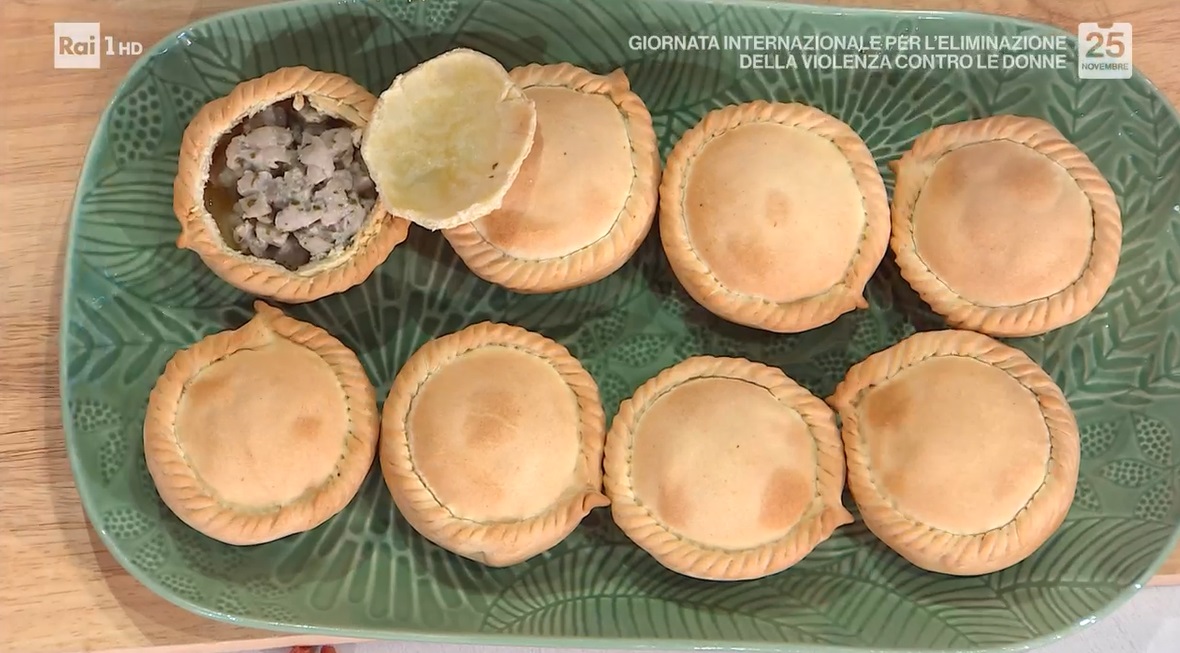Prepariamo un impasto di semola, acqua e sale. Ottenuto un panetto liscio ed omogeneo, lo avvolgiamo nella pellicola e lo lasciamo riposare per mezz’ora. Lo stendiamo con il matterello ad uno spessore di mezzo cm. Spalmiamo sopra parte dello strutto e ripieghiamo la pasta sullo strutto. Stendiamo ancora con il mattarello e proseguiamo con lo strutto e ancora ripieghiamo e stendiamo. Proseguiamo fino ad esaurire lo strutto. Una volta pronta la pasta, la tiriamo con la sfogliatrice, ad uno spessore di 2-3 mm. Ritagliamo dei dischi: alcuni piccoli ed altri leggermente più larghi.