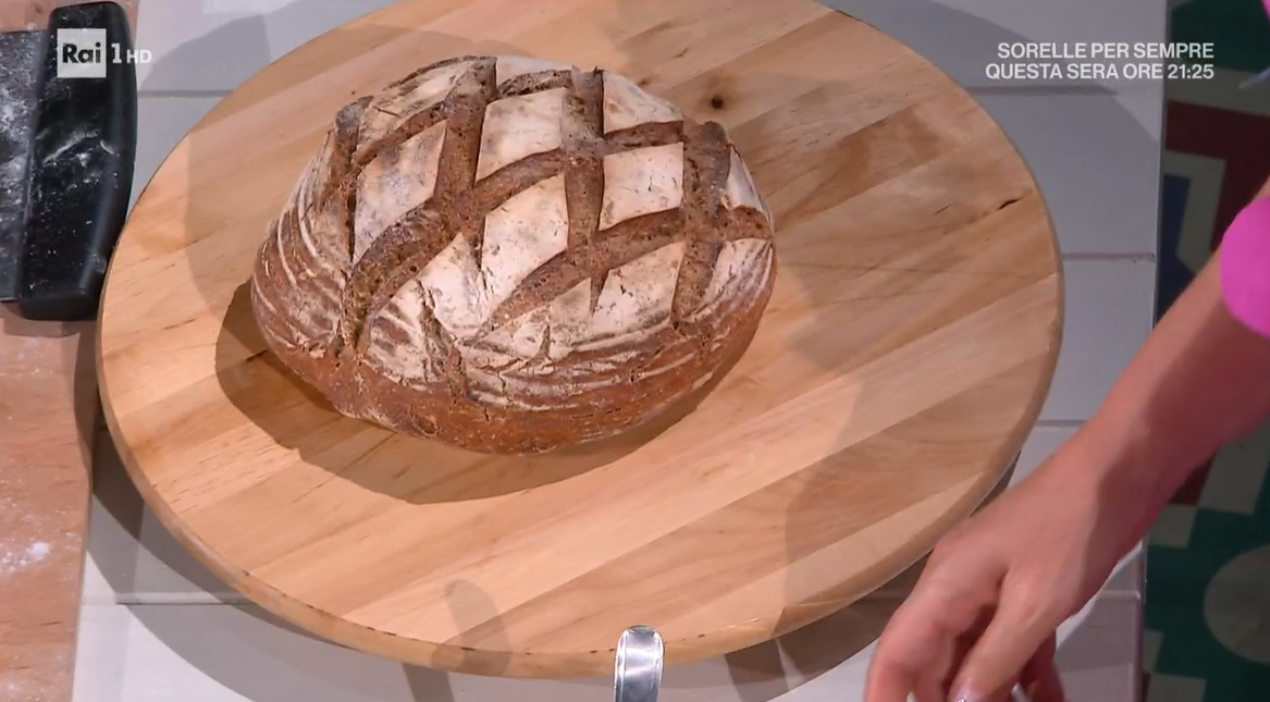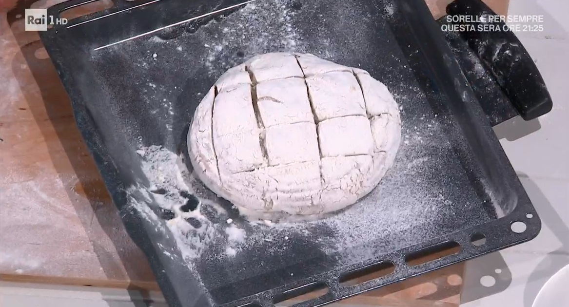 Dividiamo l’impasto lievitato in due parti e formiamo due pagnotte, senza ripiegarle eccessivamente: non dobbiamo sgonfiarle. Le inseriamo all’interno di due cestini per pane infarinati. Copriamo e lasciamo lievitare ancora 2 ore a temperatura ambiente.