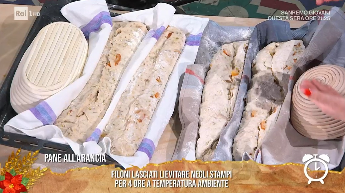 - 500 g farina tipo 2, 500 g farina 0, 200 g lievito madre o 7 g lievito di birra fresco, 400 g acqua, 200 g succo di arancia, 22 g sale, 30 g olio, 100 g arancia candita a cubetti, 100 g pistacchi sgusciati, scorza di 1 arancia, olio di semi