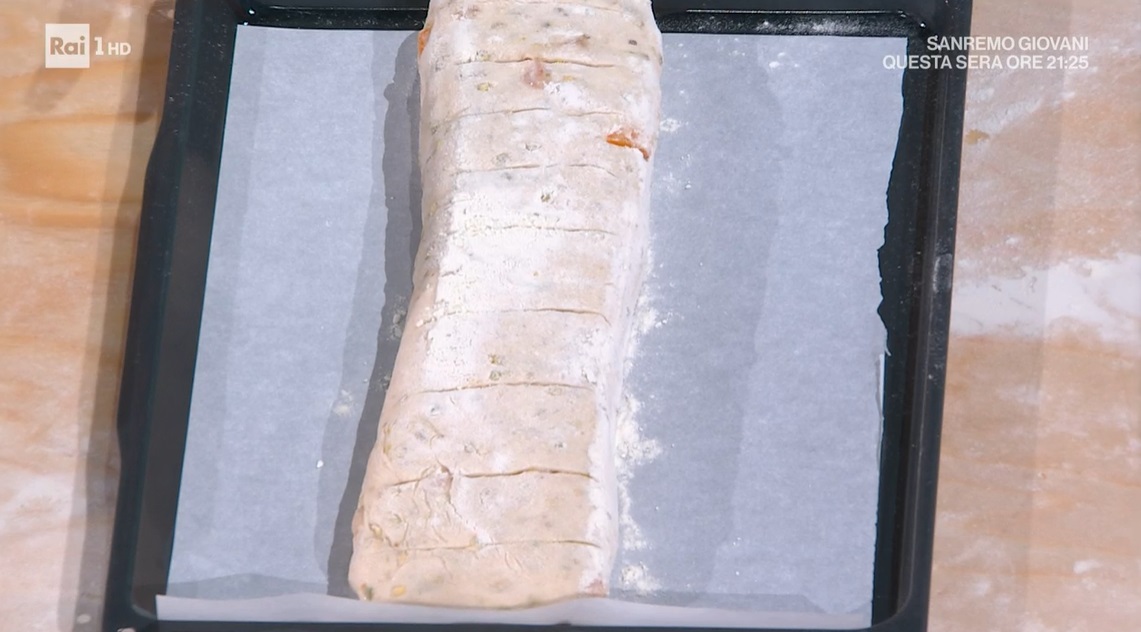 Dividiamo l’impasto in due parti. Le schiacciamo leggermente con le mani, quindi diamo la forma di due filoni: non vanno piegati troppo.