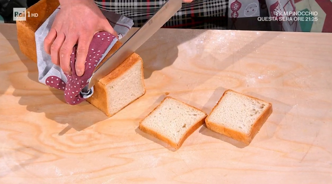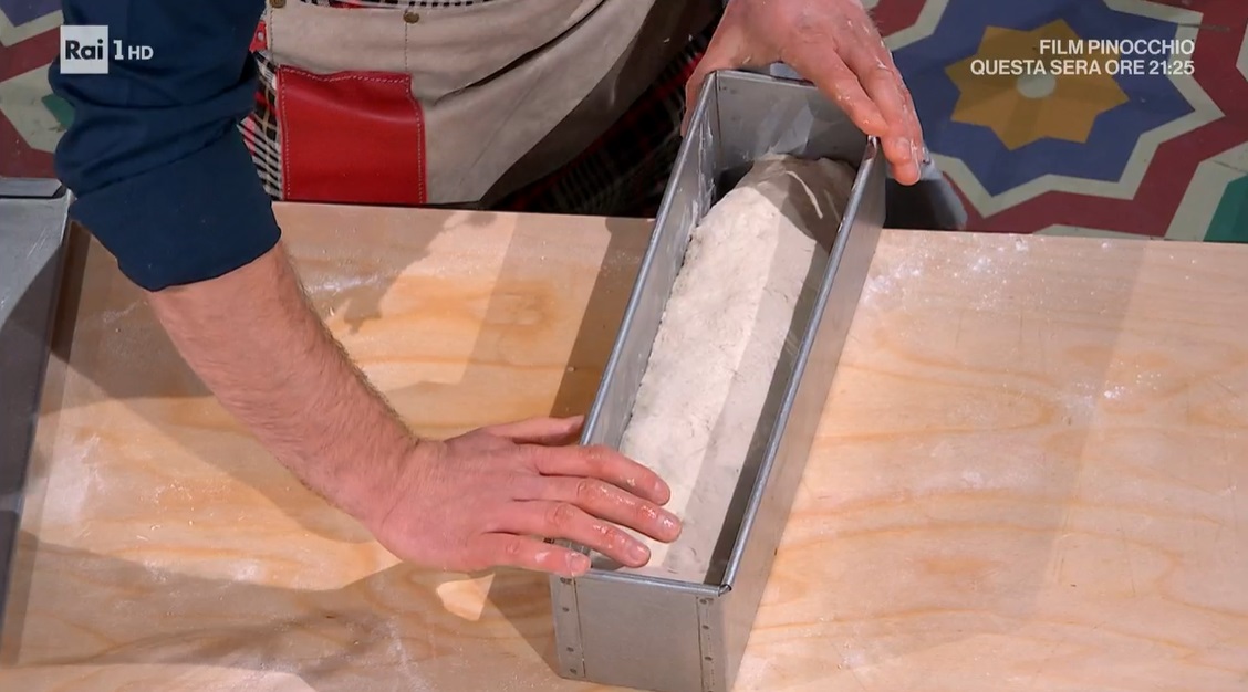 Allarghiamo l’impasto sul piano e lo ripieghiamo su se stesso, formando un filone stretto. Lo inseriamo in una cassetta per pane lunga 40 cm. Schiacciamo il pane dentro la cassetta, in modo che arrivi fino a metà dell’altezza della cassetta. Mettiamo il coperchio e lasciamo lievitare fino a quando l’impasto riempie la cassetta. Cuociamo in forno caldo e statico a 200° per 40 minuti.