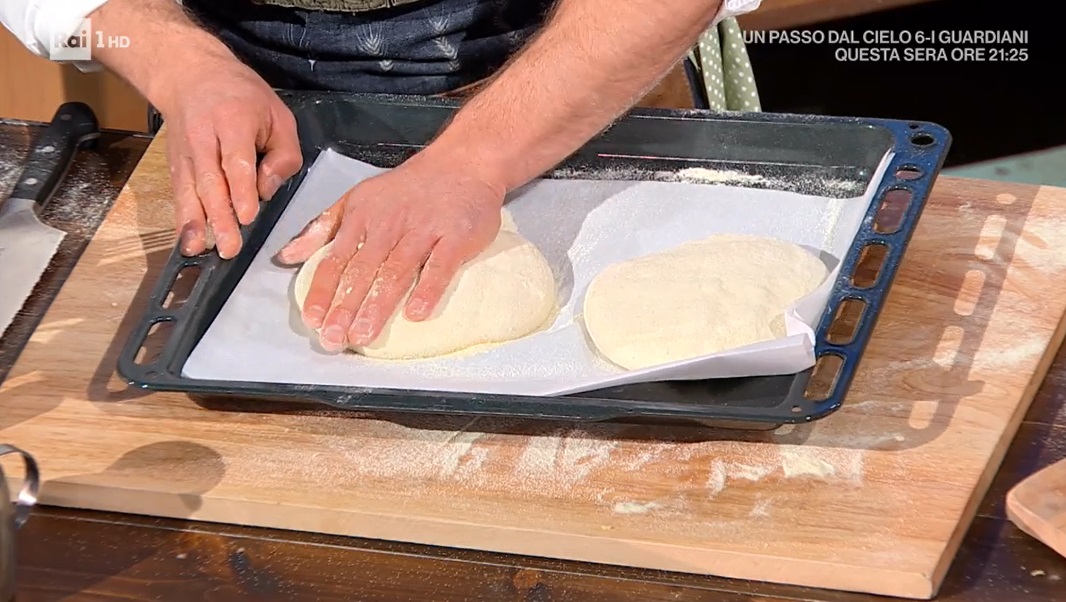 Trasferiamo l’impasto lievitato sul ripieno infarinato. Formiamo delle palline da circa 400 g, ripiegandole su se stesse (lembi esterni verso l’interno). Le posizioniamo sulla teglia con carta forno, rivolgendo le pieghe verso l’alto. Copriamo e lasciamo riposare 30 minuti. Le prendiamo, le giriamo e le schiacciamo delicatamente con la mano, direttamente sulla teglia, in modo da ottenere delle pagnotte basse. Copriamo e lasciamo lievitare ancora 1 ora a temperatura ambiente.