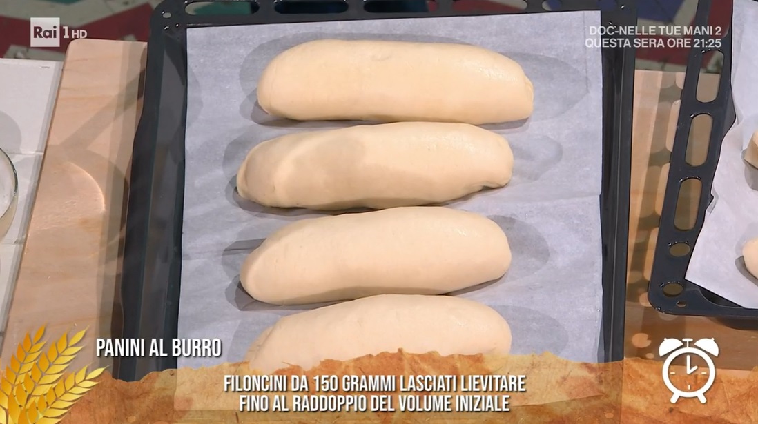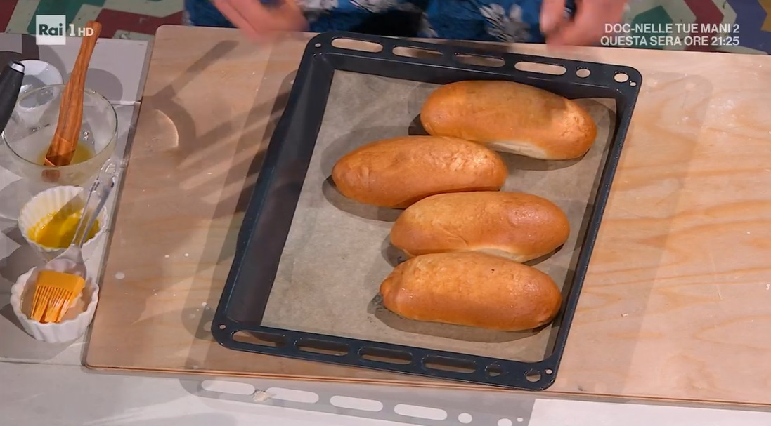 Ricaviamo dei panetti di circa 150 g, che ripieghiamo su loro stessi, formando dei filoncini. Li disponiamo su una teglia con carta forno, li copriamo e lasciamo lievitare fino al raddoppio (circa 2 ore).