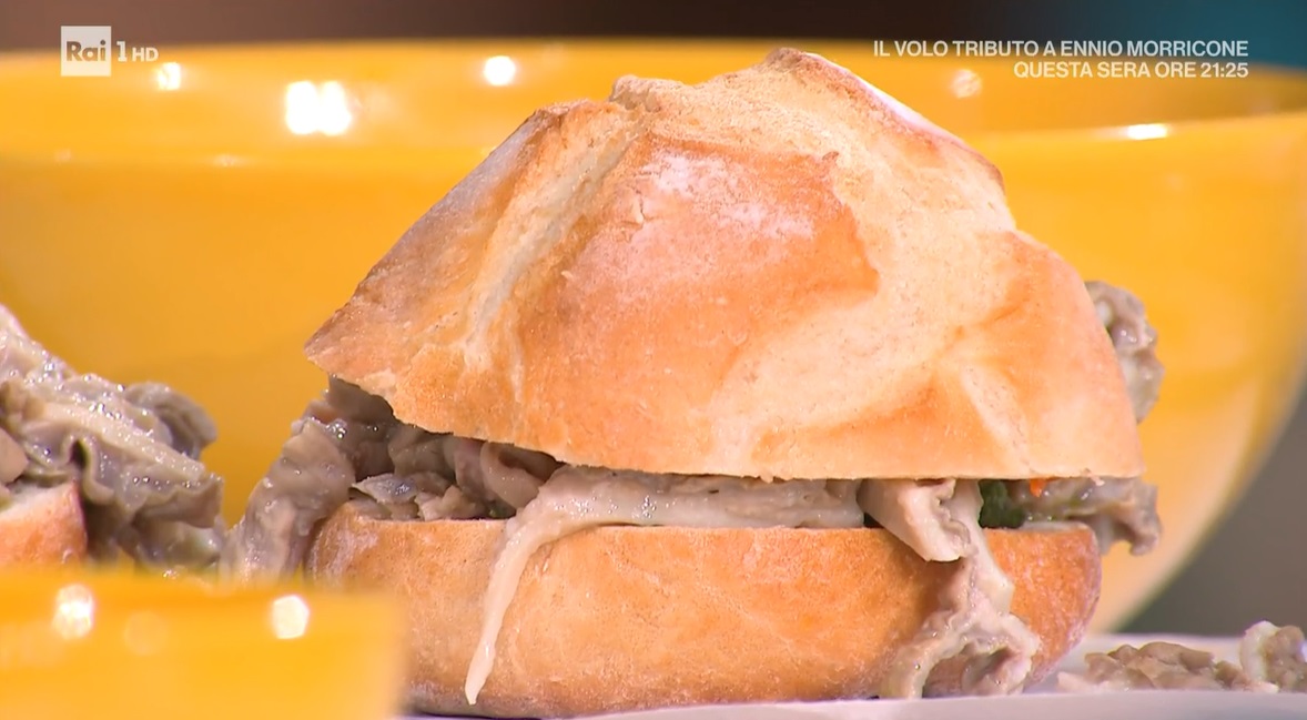 - 4 semelle (panini), 800 g lampredotto, 2 l acqua fredda, 5 g concentrato di pomodoro, 1 carota, 1 costa di sedano, 1 ciuffo di prezzemolo, 1 pomodoro, 2 cipolle bionde, bacca di ginepro, 3 foglie di alloro, sale e pepe
