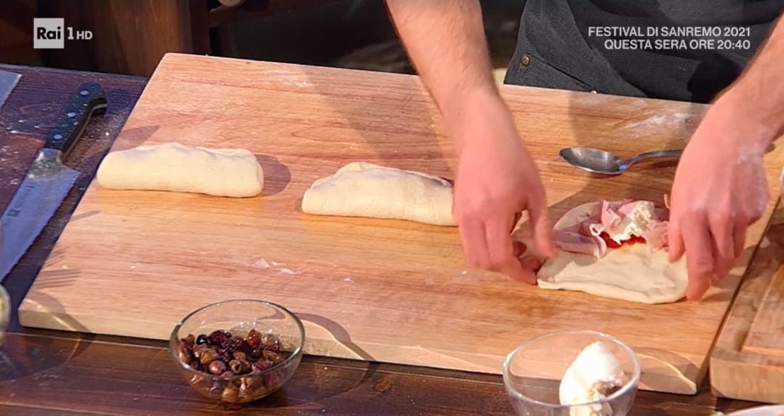 Con le mani, sul piano, allarghiamo i panetti, in modo da ottenere dei dischetti sottili anche sui lati. Mettiamo su un lato un po’ di pomodoro pelato, la mozzarella asciutta e del prosciutto cotto. Oppure, cipolle stufate, olive denocciolate; oppure, mortadella e provola o mozzarella a cubetti.