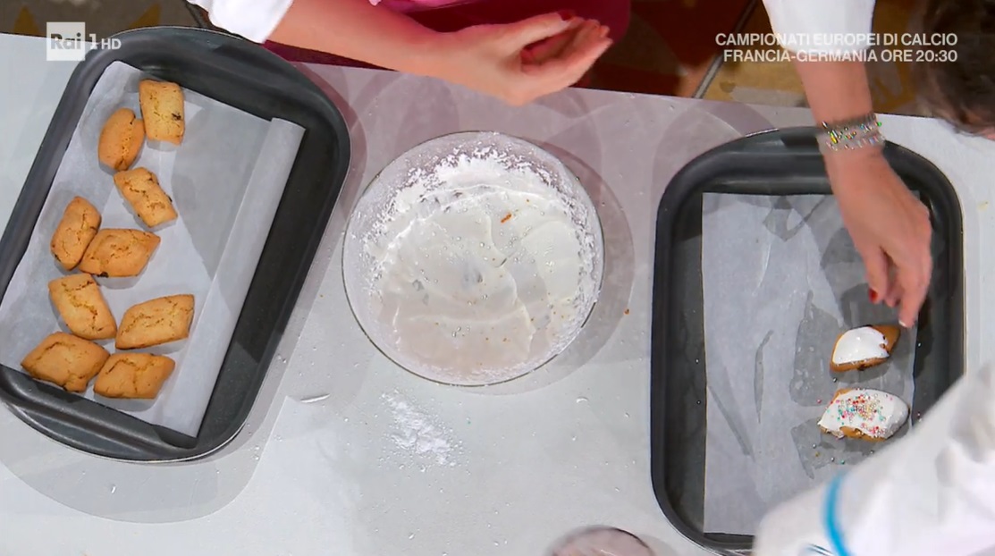 Una volta pronti i biscotti, immergiamo la superficie dei biscotti nella glassa, quindi li disponiamo sulla teglia e li spolveriamo subito con i diavolini colorati. Rimettiamo nel forno ancora caldo, a circa 85°, per circa 10-15 minuti (in questo modo pastorizziamo l’albume).