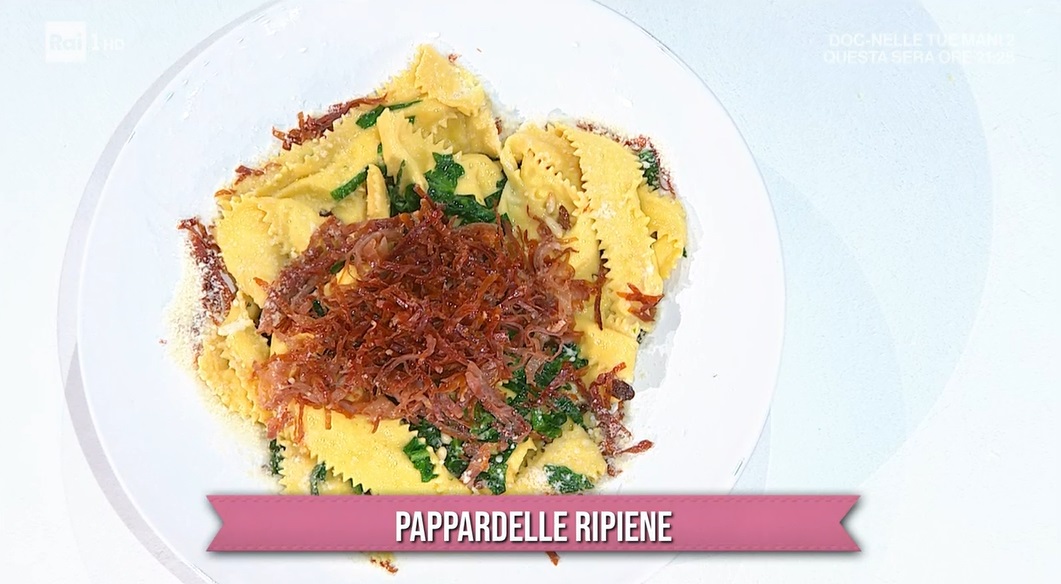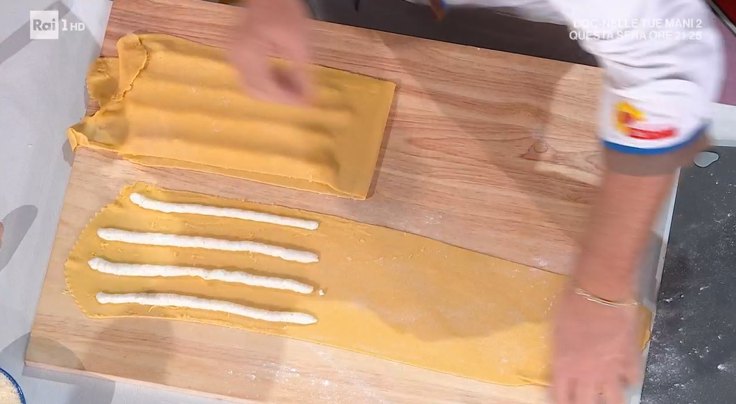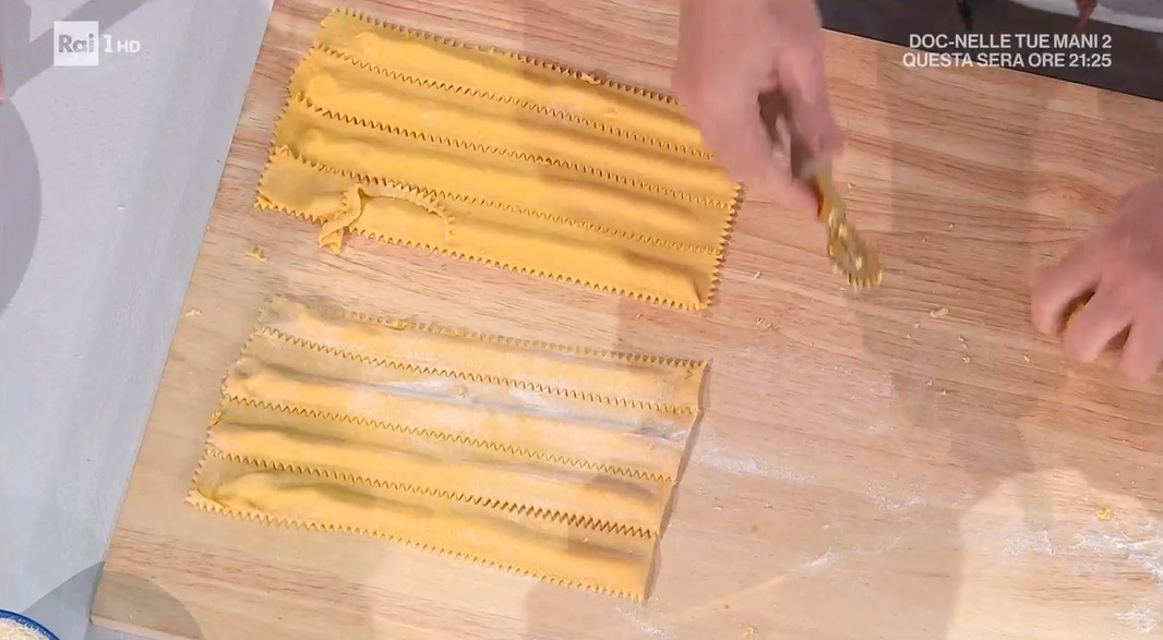 Tiriamo la sfoglia sottile e su un lato formiamo un serpentello di ripieno. Ripieghiamo la sfoglia sul ripieno e la facciamo ben aderire, facendo uscire tutta l’aria. Ritagliamo le pappardelle. Le cuociamo in acqua bollente e salata per il tempo necessario.