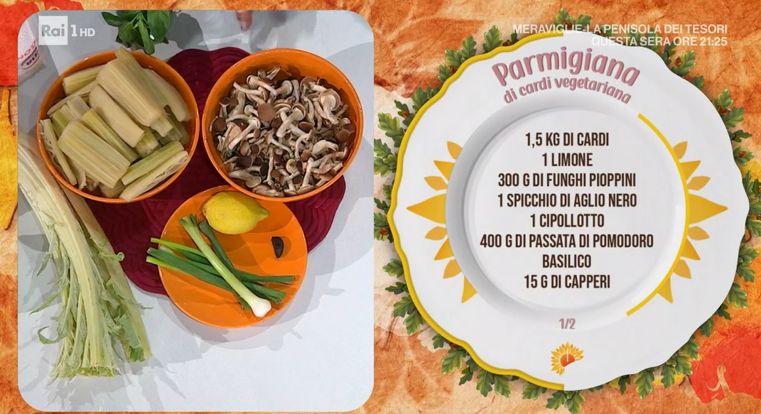 - 1,5 kg cardi, 1 limone, 300 g funghi pioppini, 1 spicchio d’aglio nero, 1 cipollotto, 400 g passata di pomodoro, basilico, 15 g capperi, 300 g besciamella, 500 g scamorza affumicata, origano, 150 g formaggio grattugiato, 2 tuorli, 50 g pangrattato, sale e pepe, olio evo