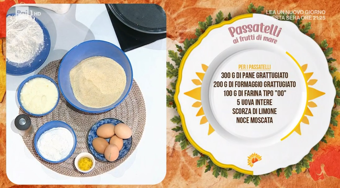 Prepariamo i passatelli: in una ciotola, misceliamo il pangrattato con il formaggio grattugiato e la farina. Profumiamo con la scorza di limone grattugiata e la noce moscata. Aggiungiamo tutte le uova intere e lavoriamo fino ad ottenere un impasto omogeneo. Copriamo e lasciamo riposare.