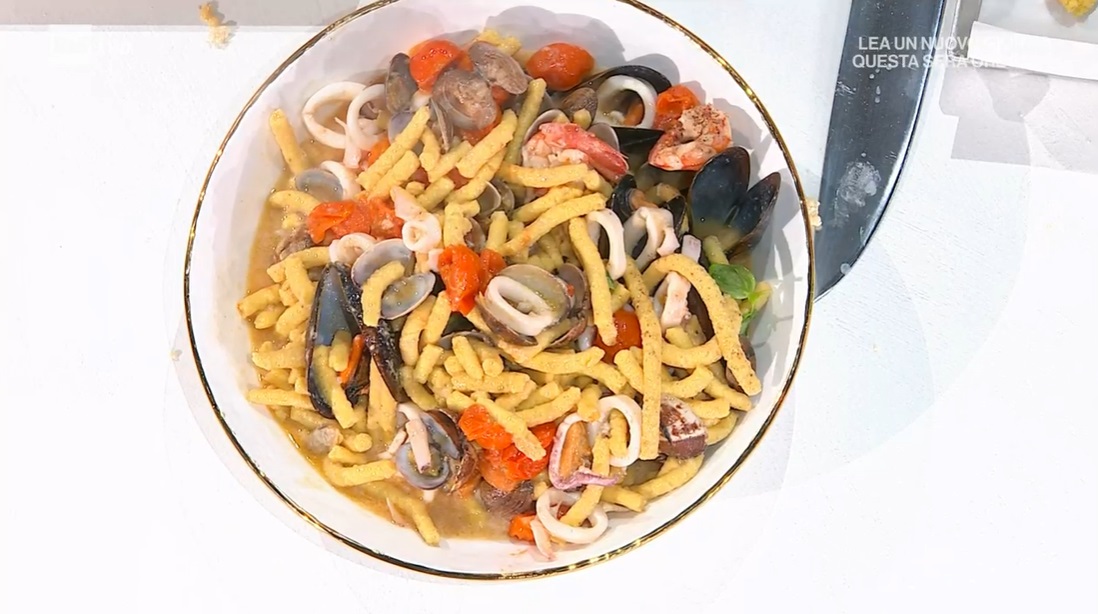 Per il condimento, in padella, scaldiamo un filo d’olio con uno spicchio d’aglio. Uniamo i pomodorini a metà e lasciamo cuocere qualche minuto. Uniamo i calamari a striscioline e facciamo rosolare qualche istante. Uniamo, quindi, i gamberi puliti e, infine, le vongole e le cozze ben pulite. Sfumiamo con il vino bianco.