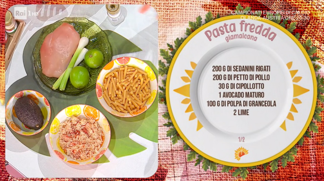 - 200 g sedanini, 200 g petto di pollo, 30 g cipollotto, 1 avocado maturo, 100 g polpa di granceola, 2 lime, 1 uovo medio, 210 ml olio di semi di girasole, 5 g senape, 100 g yogurt magro, 100 g carote grattugiate, 100 g mais, 10 g sale, pepe