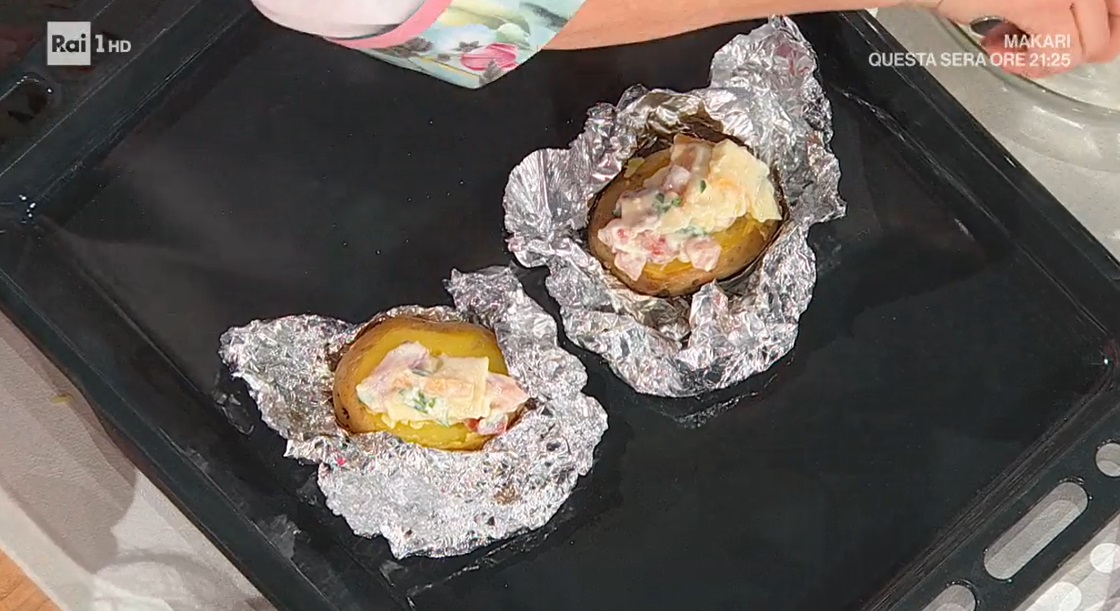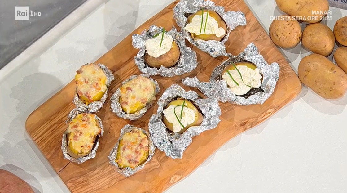 Per la farcitura alternativa, quella a freddo: mescoliamo la panna acida con la robiola e l’erba cipollina tritata finemente. Farciamo le patate precotte (anche bolline) e scavate con la crema ottenuta. Serviamo fredde.