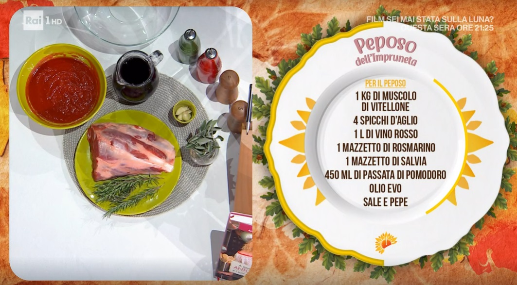 - 1 kg muscolo di vitellone, 4 spicchi di aglio, 1 l vino rosso, rosmarino, salvia, 450 ml passata di pomodoro, olio evo, sale e pepe