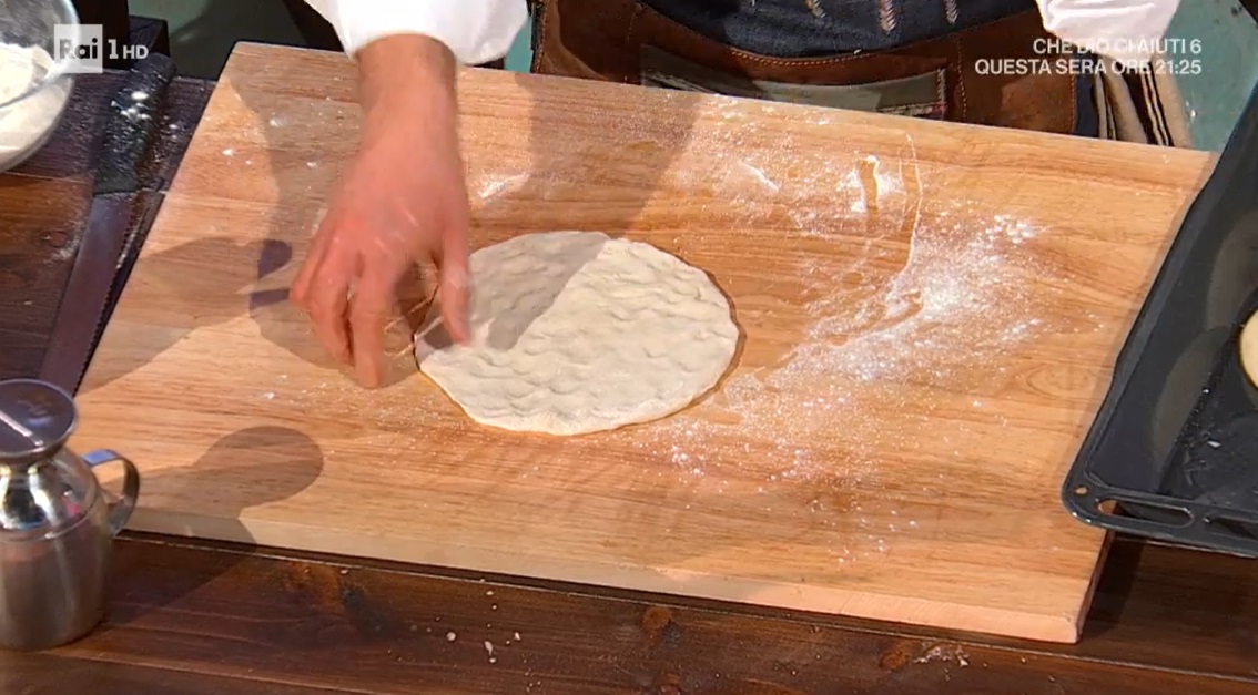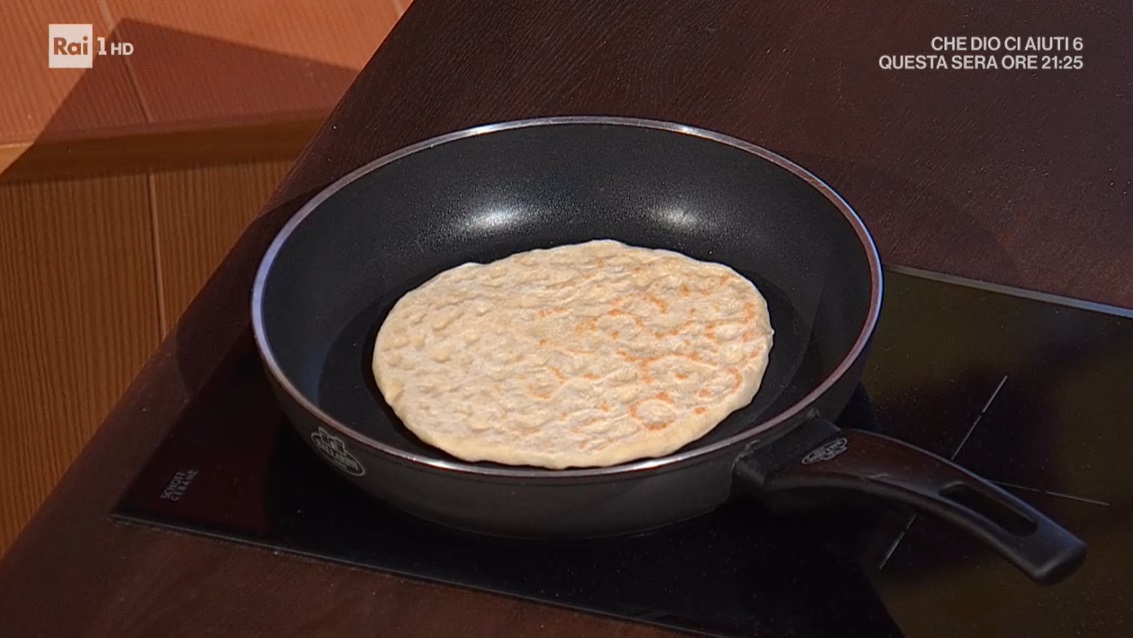 Mettiamo la pallina riposata su un piano infarinato e la stendiamo con le dita, come fosse una pizza: dobbiamo ottenere un disco sottile, anche sui bordi. Scaldiamo per bene una padella e mettiamo a cuocere i dischi di pasta, sui due lati.