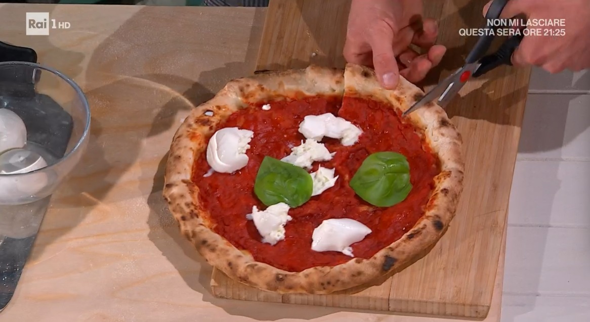 Preriscaldiamo il forno a 250° con dentro la placca in dotazione. Quando il forno è a temperatura, estraiamo la teglia rovente (o pietra refrattaria), la capovolgiamo, mettiamo sopra la pizza e la rimettiamo subito in forno a 250° per 9 minuti (5 minuti parte bassa del forno, 4 minuti vicino al grill). All’uscita dal forno, finiamo con la bufala stracciata.