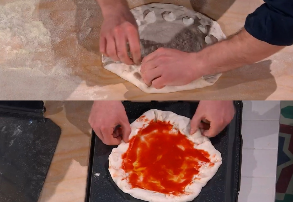 Stendiamo ciascun panetto sul piano infarinato, in modo da ottenere un disco sottile anche sui bordi. Formiamo il cornicione con la ricotta lavorata a crema con olio, sale e pepe. Ripieghiamo i lembi esterni dell’impasto sulla ricotta, schiacciando per bene sulle giunture. Condiamo al centro nel modo classico, con la passata di pomodoro (non troppa), olio, basilico.