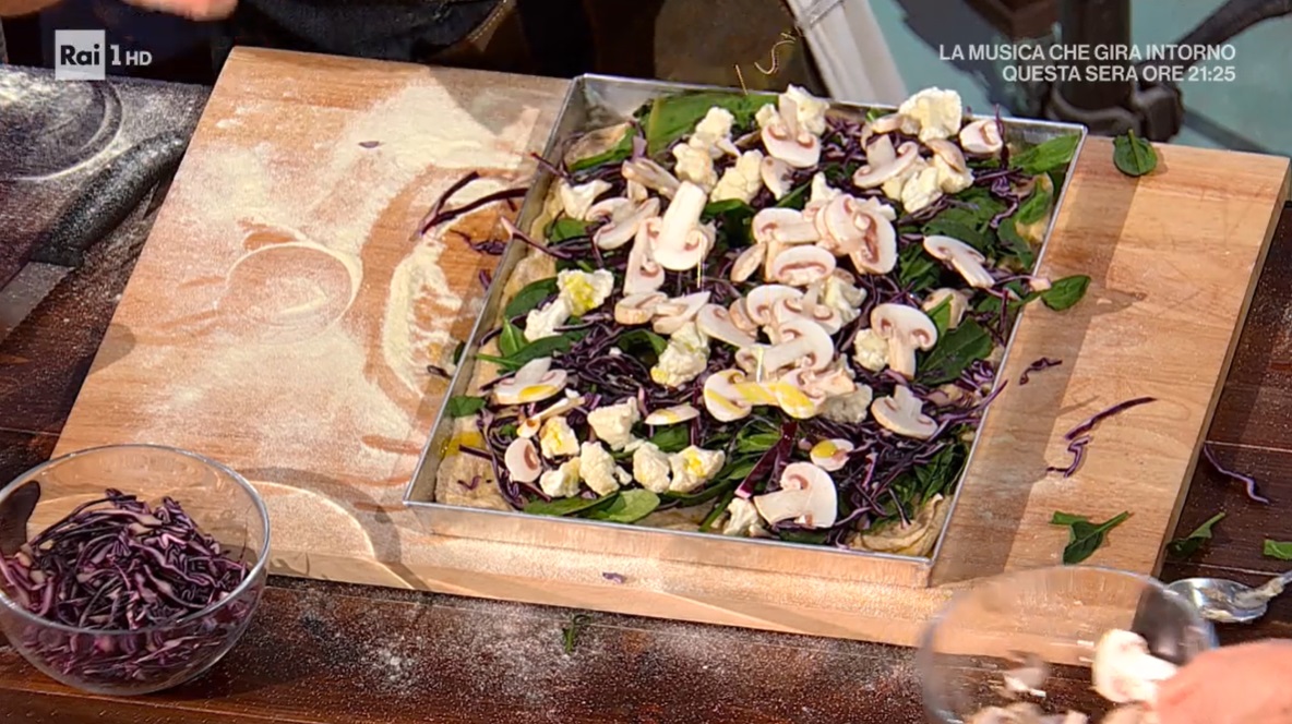 Allarghiamo l’impasto lievitato con le mani su un piano infarinato. Lo trasferiamo all’interno della teglia ben oleata e la allarghiamo con le mani, in modo da riempire completamente la teglia. Fulvio distribuisce sopra lo spinacino ancora crudo, il cavolo viola affettato finemente ed ancora crudo, il cavolfiore crudo a cimette, gli champignon affettati. Finiamo con un filo d’olio ed una spolverata di sale e cuociamo in forno caldo e statico a 250° per 20 minuti: primi 10 minuti nella parte bassa del forno, gli ultimi 10 in quella alta. Appena sfornata, spolveriamo la pizza con abbondante formaggio grattugiato.