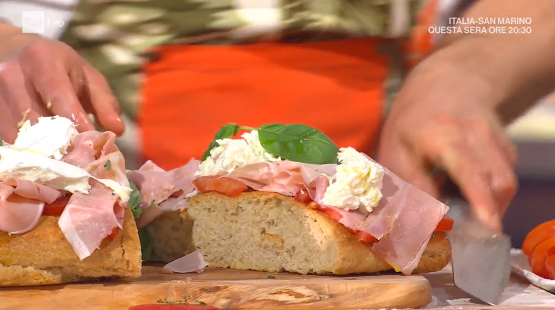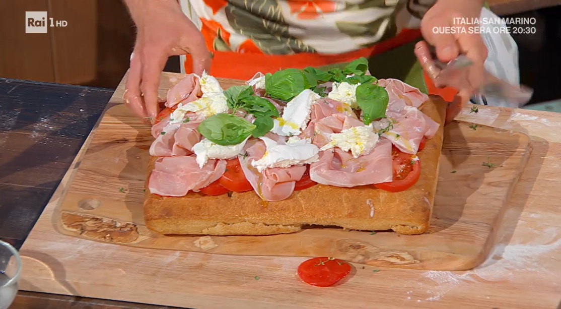 Condiamo, in superficie, con i pomodori freschi a fette, sale, prosciutto cotto affettato, mozzarella di bufala stracciata a mano, timo e basilico.