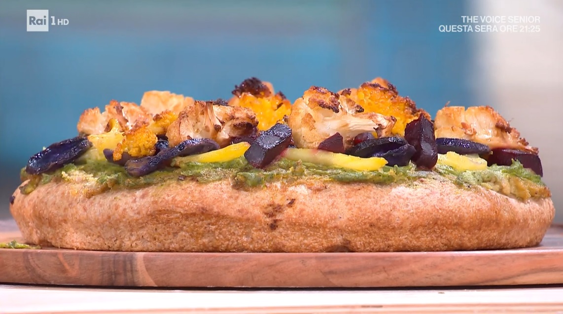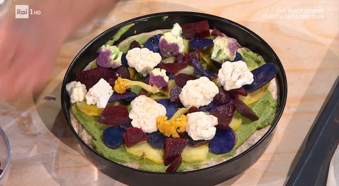 Spalmiamo sulla pizza lievitata la crema di broccoli (li lessiamo, li scoliamo e li frulliamo con il mixer ad immersione, aggiungendo un filo d’olio), quindi disponiamo sopra le patate a fette cotte in precedenza (le tagliamo a rondelle e le cuociamo in forno a 200° per 30 minuti) e, infine, la barbabietola precotta a dadini e le cimette di cavolfiore crudo. Condiamo il tutto con olio e sale e cuociamo in forno caldo e statico a 250° per 35 minuti.