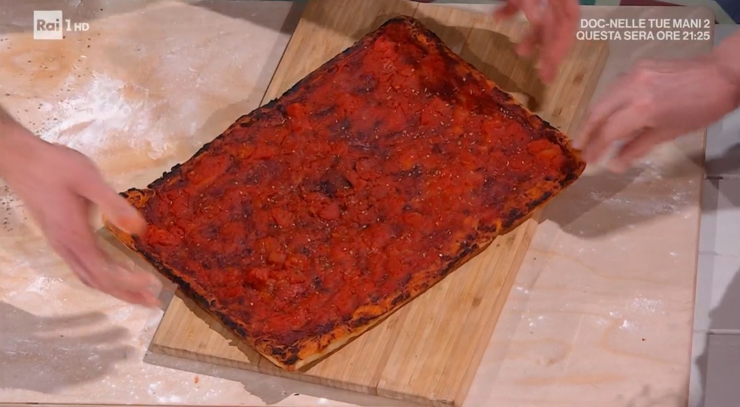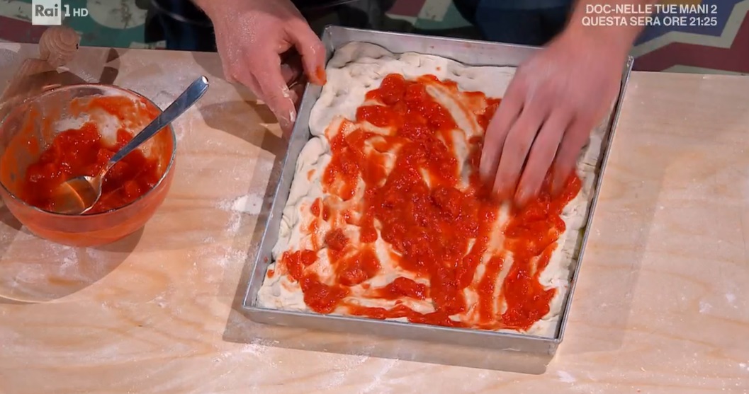 Prendiamo un panetto lievitato e lo stendiamo con il mattarello, ad uno spessore di circa 1 cm. La inseriamo in una teglia rettangolare ben unta d’olio e la allarghiamo all’interno, fino ad arrivare ai bordi. Condiamo la superficie con i pelati schiacciati a mano e l’origano e cuociamo in forno caldo e statico a 250° per 16 minuti.