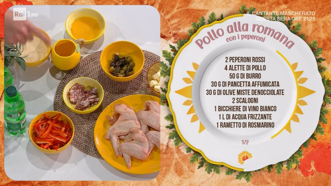 - 2 peperoni rossi, 4 alette di pollo, 50 g burro, 30 g pancetta affumicata, 30 g olive miste, 2 scalogni, 1 bicchiere di vino bianco, 1 l acqua frizzante, rosmarino, salvia, 2 uova, 100 g formaggio grattugiato, 100 g pangrattato, 1 coscia di pollo, burro, rosmarino, olio evo